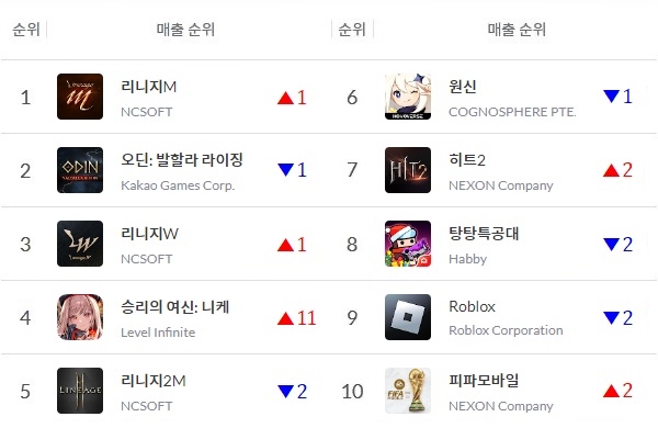 매출 1위를 두고 엔씨소프트(NC) '리니지M'과 카카오게임즈 '오딘: 발할라 라이징'이 순위다툼을 벌이는 가운데 '니케' 외에도 넥슨의 '피파 모바일'이 새로이 톱10에 올랐다.