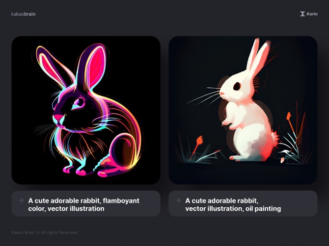 예를 들어 크리에이터가 "a black rabbit in the style of an oil painting(유화로 그린 검은 토끼)"라는 제시어를 입력하면 '칼로'가 제시어의 맥락을 이해하고 검은 토끼의 이미지를 유화 화풍으로 상상해 그려낸다.