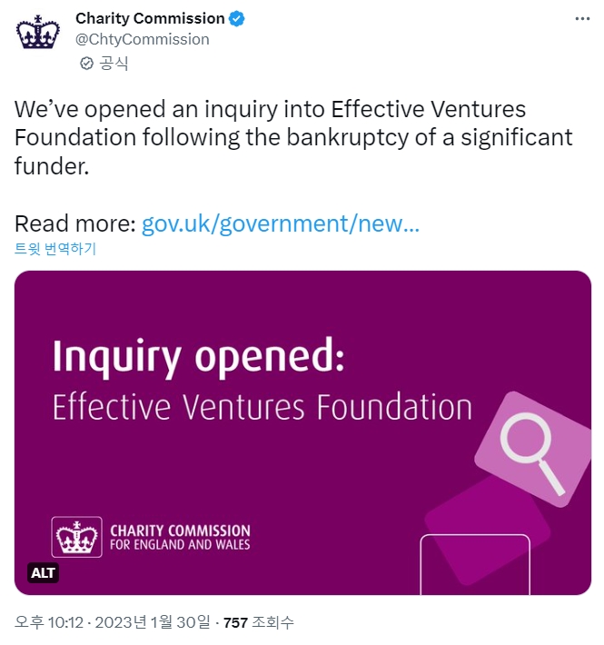 자선 위원회는 이날 트위터를 통해 "우리는 중요한 자금 제공자가 파산한 후에 이펙티브 벤처스 재단에 대한 조사를 시작했다"고 트윗했다.