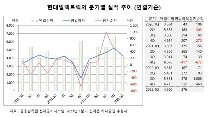 하나증권은 현대일렉트릭의 올해 1분기 연결기준 매출액이 4260억원, 영업이익이 276억원에 이를 것으로 전망하고 있습니다.