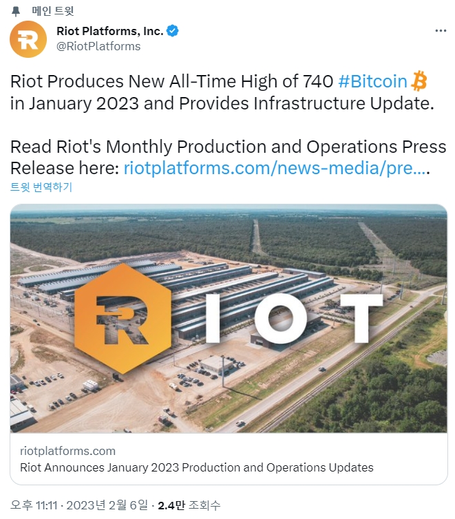 라이엇은 또한 2023년 1월 31일 현재 약 6978 BTC를 보유하고 있다고 밝혔다. 이 회사는 지난 달 700 BTC를 판매해 약 1370만 달러의 순수익을 창출했다고 말했다.