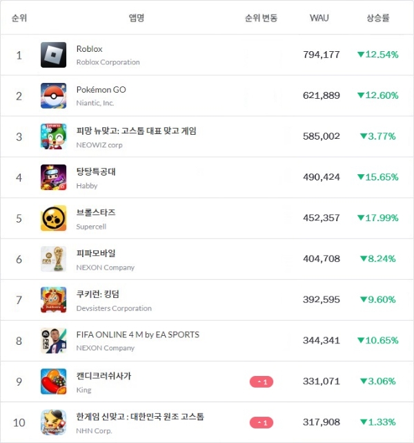 구글 플레이스토어 2월 1주차 WAU 톱10 게임 중 가장 높은 수익을 거둔 것은 매출 5위 로블록스였다. 또 '피파 모바일'이 6위, 탕탕특공대가 10위, 피파 온라인 4M이 11위, 쿠키런: 킹덤이 20위, 캔디크러쉬사가가 36위를 차지했다.