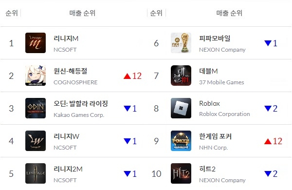'원신'의 매출 상승에 엔씨소프트(NC) '리니지M'을 제외한 상위권 게임들은 대부분 순위가 하락한 가운데 NHN의 '한게임 포커'가 매출 톱10에 복귀했다.
