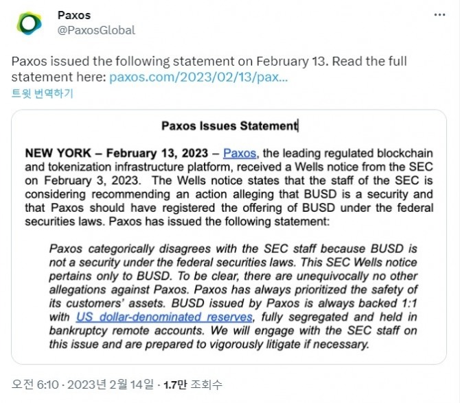 13일 성명에서 BUSD 발행사인 팍소스는 미국 증권거래위원회(SEC)로부터 '웰스 노티스'를 받았다는 최근 보도를 확인했다. 통지서에 따르면 BUSD 및 연방 증권법에 따라 등록하지 않은 혐의를 받고 있다.