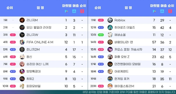 국내 월 매출 순위에선 엔씨소프트(NC) '리니지' 시리즈와 카카오게임즈 '오딘: 발할라 라이징'이 지속적인 강세를 보인 가운데 넥슨 '피파 온라인 4M'이 중국계 게임 '탕탕특공대'를 밀어내고 5위에 올랐다.