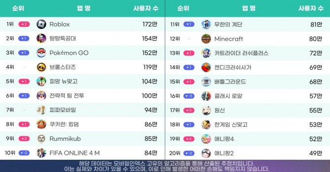 로블록스가 대두됨에 따라 중국계 게임사 하비의 '탕탕특공대', 미국의 나이언틱이 개발한 '포켓몬 고' 등이 순위가 하나씩 하락했다. 국산 게임 중 가장 높은 순위에 오른 것은 네오위즈의 '피망 뉴맞고'다.