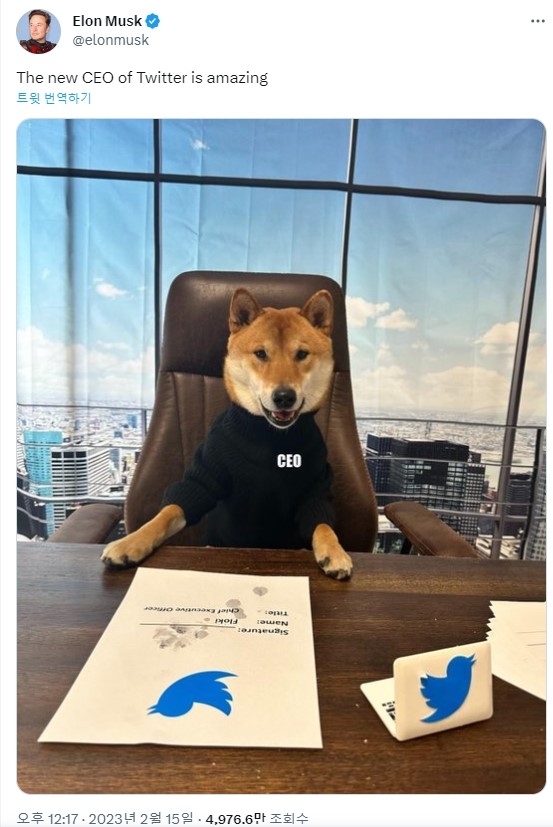 머스크는 15일 그의 개 플로키의 이미지와 함께 "트위터의 새로운 CEO는 놀랍다"는 글을 트위터에 올렸다. 머스크는 도지코인의 공동 설립자인 빌리 마커스에게 "그는 완벽하다"고 답했고, 그는 "내 생각에 그 일을 맡을 만큼 미친 유일한 사람인 것 같다"고 말했다.