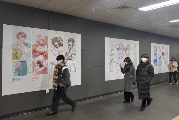 홍대입구역 내부에는 10명 이상의 니지산지 일본 본사 소속 버추얼 유튜버들의 이미지가 전시됐다. 이들은 지난해 2월, 일본 본사에 통합된 한국 지부의 멤버들이다. 팬들은 인근 합정역, 나아가 잠실역과 건대입구역에도 광고를 진행했다.