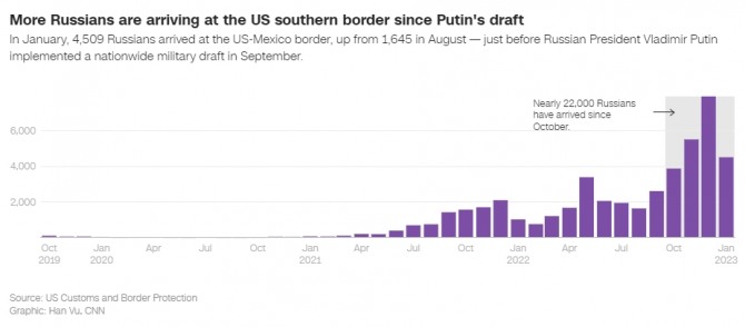 CNN에 따르면 미국 세관국경보호국(USCBP)이 지난 1월 기준으로 미국의 남부 국경지대를 통해 입국한 러시아 국민의 규모를 파악한 결과 4509명인 것으로 파악됐다.