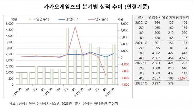 하나증권은 카카오게임즈의 올해 1분기 영업수익이 3297억원, 영업이익이 579억원에 이를 것으로 전망하고 있습니다.