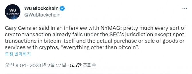 게리 겐슬러 위원장은 최근 뉴욕매그(NYMAG)와 가진 인터뷰에서 비트코인을 제외한 모든 암호화폐 거래가 증권법에 해당한다는 자신의 의견을 재천명했다.