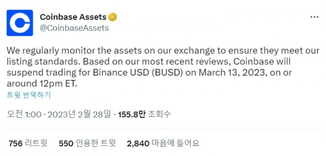 코인베이스 에셋은 28일 트위터를 통해 "우리는 정기적으로 거래소의 자산이 우리의 상장 기준을 충족하는지 확인하기 위해 감시한다. 가장 최근의 리뷰에 따르면, 코인베이스는 2023년 3월 13일 오후 12시경에 바이낸스 USD(Binance USD)에 대한 거래를 중단할 것이다"고 적었다.
