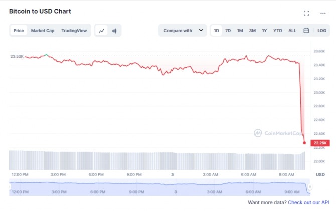 이 매체는 실버게이트 자본이 무너지면서 비트코인 가격은 2만3000달러 이상으로 꾸준히 유지된다고 전했으나 오전 10시 20분 경부터 비트코인 가격은 곤두박질치기 시작해 5.6% 이상 급락해 최저 2만2241달러까지 떨어졌다. 비트코인이 2만2200달러 수준으로 내려간 것은 지난 2월 15일 이후 처음이다.