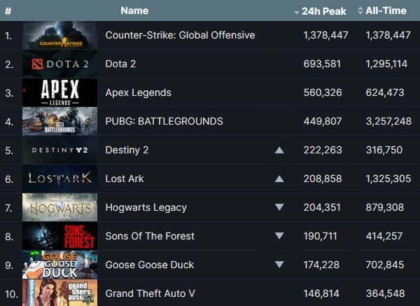 데스티니 가디언즈 외에도 스마일게이트가 개발하고 아마존 게임즈가 운영하는 '로스트아크' 스팀판의 순위가 8위에서 6위로 뛰어올랐다. 2월 신작 '호그와트 레거시'와 '선즈 오브 더 포레스트' 얼리 억세스(앞서 해보기) 판은 각각 6위에서 7위, 5위에서 8위로 하락했다.