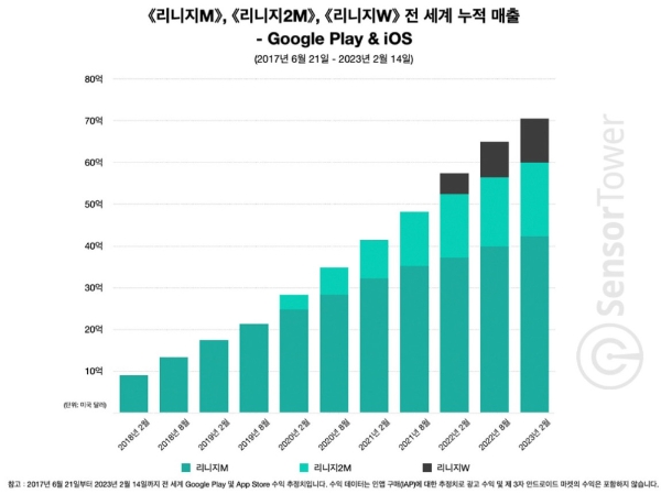 이미지 확대보기앱 통계 분석 플랫폼 센서타워에 따르면 '리니지' 모바일 3부작의 글로벌 양대 앱 마켓(구글 플레이스토어·애플 앱스토어) 총 누적 매출은 2월 14일을 기점으로 70억달러(약 9조1714억원)를 돌파했다. 지난 2017년 6월 출시된 '리니지M'이 전체 매출의 60%를 차지했으며 2019년 11월작 '리니지2M'와 2021년 11월작 '리니지W'의 비중은 각각 25%,15%였다.