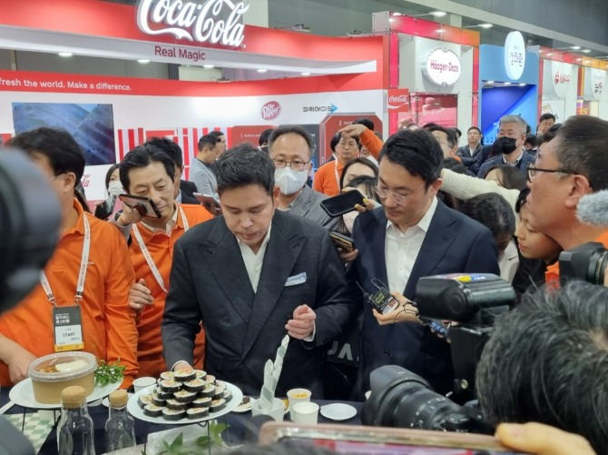 정용진 신세계그룹 부회장이 8일 오전 11시반께 서울 양재동 aT센터에서 개최된 이마트24 '딜리셔스 페스티벌'에 참석해 경영주 대상 '딜리셔스 레시피 콘테스트'에 출품된 제품을 시식하고 있다. 딜리셔스 페스티벌은 이마트24 가맹점 경영주를 대상으로 하는 행사로 올해 트렌드와 상품 전략에 대해 소통하는 장으로 마련했다.