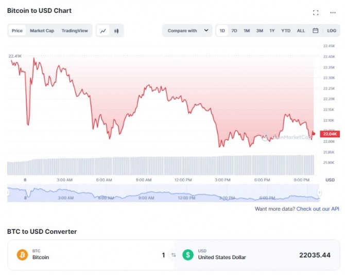 이미지 확대보기8일 코인마켓캡 데이터에 따르면 시가 기준 1위 암호화폐는 아시아 거래 시간 동안 3주 최저치인 2만1964달러로 떨어졌다. 두 번째로 큰 암호화폐인 이더리움(ETH)는 8일 최저 1543달러까지 떨어졌다.