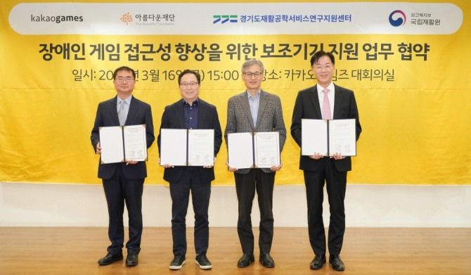 이미지 확대보기이번 협약에는 보건복지부 산하 국립재활원, 경기도재활공학서비스연구지원센터, 비영리 단체 아름다운 재단 등이 참여했다. 4개 기관은 각자의 전문성을 바탕으로 게임 보조기기 제작, 공급, 설치, 사후 관리에 이르기까지 체계적 지원에 나설 계획이다.