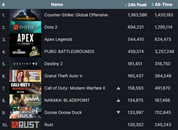 두 게임을 대신해 액티비전 '콜 오브 듀티: 모던 워페어 2' 리마스터판과 넷이즈 '나라카: 블레이드 포인트' 등이 새로이 10위에 올랐다. 이들 두 게임 위로 탑6 게임 사이에는 별다른 순위 변동이 없었다.
