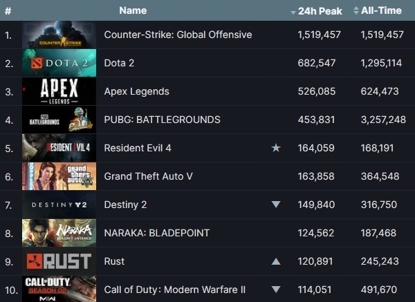'바이오하자드 4' 리메이크판이 24일 출시 직후 16만명대 동시 접속을 기록, 5위까지 치고 올라갔다. 지난주 동시 접속 9위를 기록했던 개글 스튜디오 '구스구스 덕'은 밸브 '팀 포트리스 2'에 밀려 12위에 자리 잡았다.