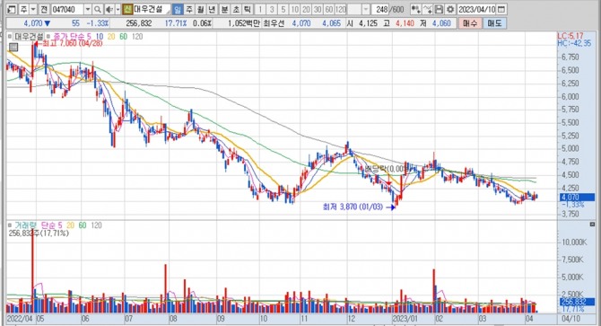 이미지 확대보기대우건설의 주가는 10일 오전 9시 30분 현재 전일보다 55원(1.33%) 내린 4070원에 거래되고 있습니다.