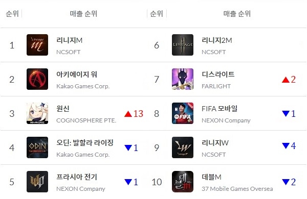 중국계 게임사 릴리스 게임스 산하 파라이트의 신작 '디스라이트'도 상승세를 보인 가운데 두 게임을 제외한 매출 최상위권 게임들이 대부분 소폭 하락했다. 다만 1위 엔씨소프트(NC) '리니지M'과 2위 카카오게임즈 '아키에이지 워'만은 꾸준히 자리를 지키고 있다.
