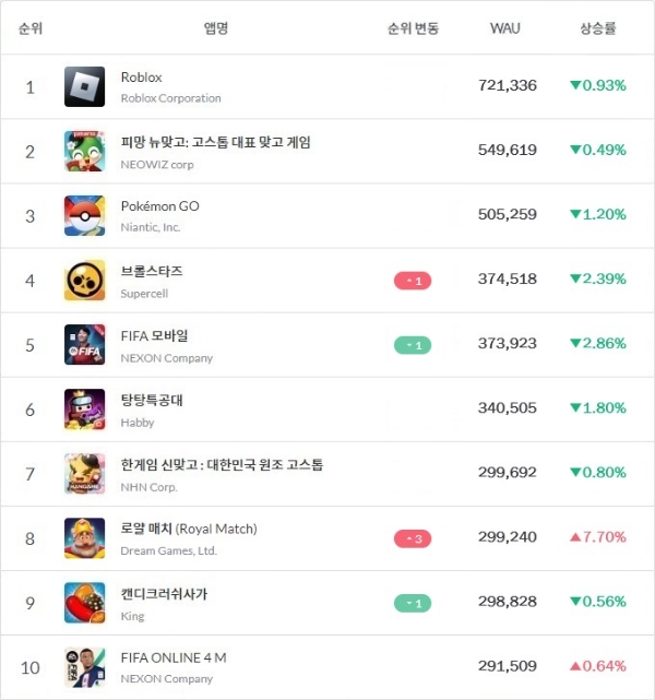 로블록스·피망 뉴맞고·포켓몬 고 등은 이번주에도 WAU 톱3를 유지했다. 브롤스타즈와 피파 모바일은 4위 자리를 두고 지속적인 자리 다툼을 벌이고 있다. 11위 쿠키런: 킹덤의 WAU는 28만2769명이었으며 '리그 오브 레전드: 전략적 팀 전투(TFT)'가 WAU 27만6205명으로 그 뒤를 따랐다.