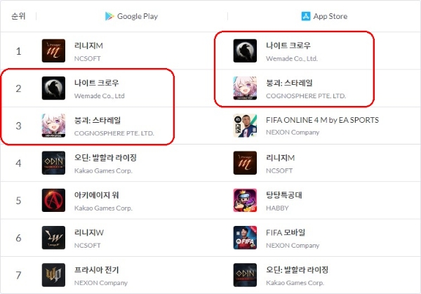 같은 시점에 두 게임은 애플 앱스토어에선 매출 1, 2위를 기록했다. 구글 플레이스토어는 통상 일주일, 애플은 24시간 단위로 매출 순위를 결산하는 것으로 알려져 있다. 두 게임이 출시 후 여러일동안 지속적으로 매출을 확보하고 있다는 것으로 해석된다.