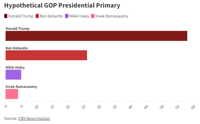 2일(현지시간) 더힐에 따르면 CBS뉴스가 여론조사업체 유고브에 의뢰해 미국 유권자를 대상으로 최근 실시한 여론조사에서 미국 공화당 대선후보 경쟁이 지금 벌어진다면 누구를 선택할지에 대해 물은 결과 응답자의 58%가 트럼프의 승리를 예상했다.