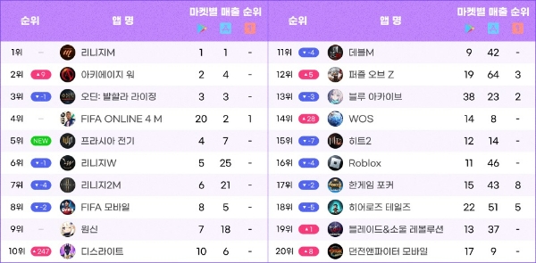 국산 신작 외에도 중국계 게임사 릴리스 게임즈 산하 브랜드 파라이트에서 3월 29일 국내 출시한 '디스라이트'가 통합 매출 10위를 차지했다. 펀플러스 산하 센추리 게임즈가 2월 출시한 'WOS: 화이트 아웃 서바이버'는 14위에 올랐다.