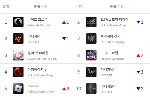 앱 통계 분석 플랫폼 모바일인덱스에 따르면 나이트 크로우는 출시 13일만인 지난 9일 매출 1위에 입성, 꾸준히 제 자리를 지켰다. 로블록스는 11일을 기점으로 5위에 올랐다.