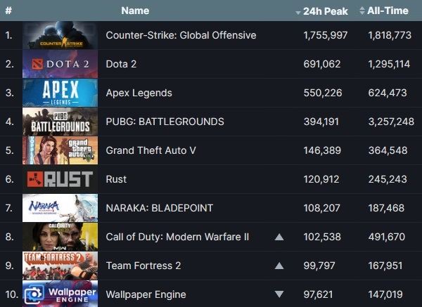스팀 운영사 밸브 코퍼레이션의 '카운터 스트라이크: 글로벌 오펜시브'와 '도타 2', 크래프톤의 '펍지: 배틀그라운드' 등 이용자 수 상위 7개 게임의 순위 변동은 없었던 가운데 액티비전 '콜 오브 듀티: 모던 워페어 2' 리마스터판이 톱10에 복귀했다.