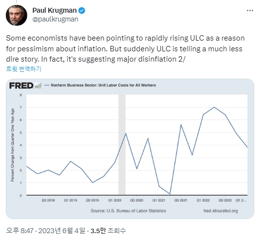크루그먼 교수는 그 근거로 “일부 경제학자들에 따르면 미국의 단위노동비용(ULC)이 최근 빠른 속도로 상승하고 있다는 지적”이라면서 “ULC가 급증했다는 것은 인플레이션이 아니라 이제부터 디스인플레이션을 걱정해야 한다는 신호”라고 밝혔다. 디스인플레이션이란 인플레이션과 반대로 물가가 지속적으로 하락하는 현상을 말한다.