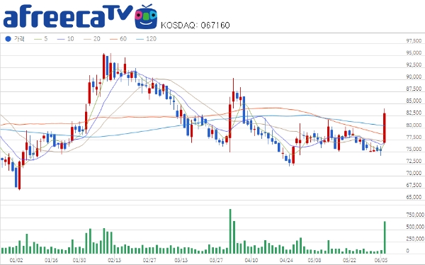 이미지 확대보기코스닥에 상장된 아프리카TV 주가는 6일 종가 기준 7만5300원에서 7일 종가 기준 8만3000원으로 10.23% 올랐다. 코스닥 총 1642 종목 중 일간 상승률 20위에 해당하는 기록이다.
