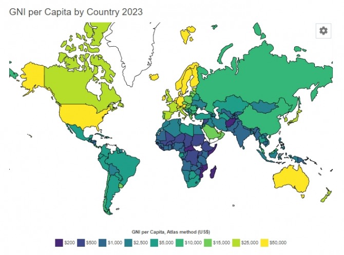 세계은행이 전세계 198개국을 대상으로 지난 2021년 기준으로 파악한 통계를 미국의 경제전문 온라인 매체 247월스트닷컴이 분석한 결과다.