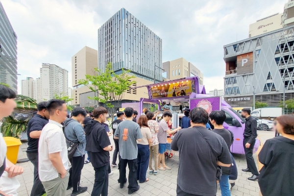 이미지 확대보기'우마무스메' 국내 이용자들은 지난 3월부터 인터넷 커뮤니티를 중심으로 모금 활동을 개시, 22일 정오 즈음 판교 카카오게임즈 사옥 인근에 트럭을 배치하고 아이스 커피를 무료로 나눠주는 행사를 열었다.