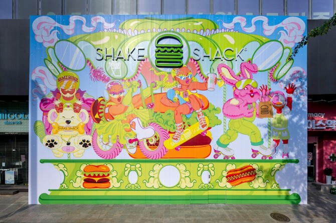 쉐이크쉑은 강남점 이전 오픈에 앞서 강렬한 색감을 사용하는 아티스트 서인지 ‘SeoInji’ 와 협업해 ‘더 랜드마크 인 강남 (The Landmark in Gangnam)’이라는 호딩 아트(Hoarding Art, 공사장 주위의 임시 가림막을 활용한 예술 활동)를 선보였다.