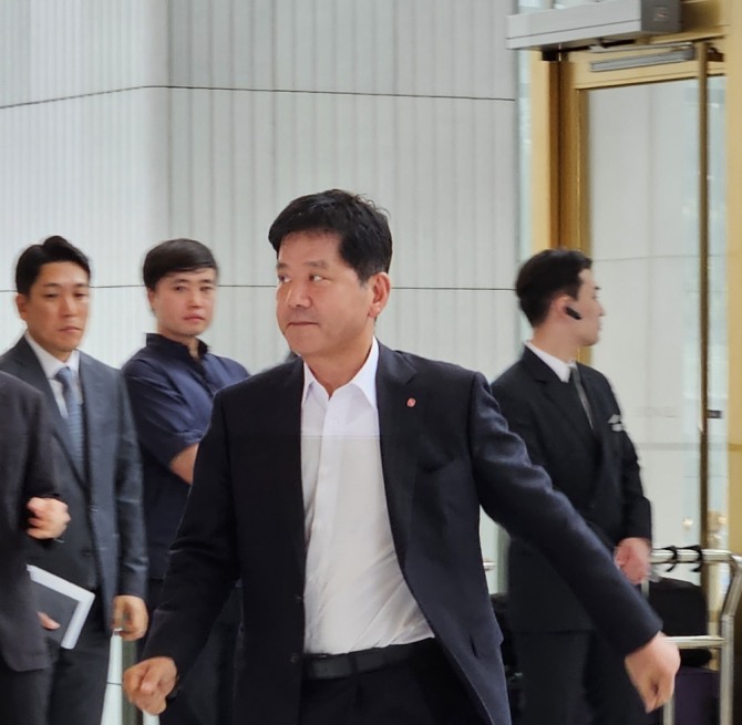 이미지 확대보기김연섭 롯데에너지머티리얼즈 대표가 18일 오후 서울 송파구 롯데월드타워 시그니엘에서 열리는 '롯데그룹 2023 하반기 밸류 크리에이션 미팅(VCM)'에 참석하기 위해 건물로 들어서고 있다.