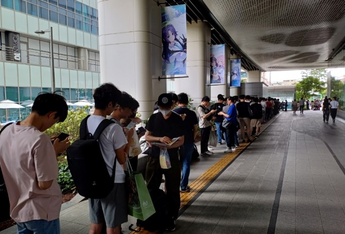 이미지 확대보기기상청이 연달아 폭염주의보를 낼 정도의 무더위, 계획에도 없던 오프라인 행사가 열렸지만 결과는 대성공이었다. AK플라자가 열리기 전인 오전 11시부터 구름 인파가 몰렸다. 오픈 후 3시간 가까이 흐른 오후 2시 직전에도 여전히 수많은 인파들이 '블루아카이브' 테마 존 구경을 위해 늘어섰다.