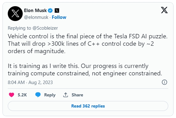그는 “글을 올리는 이 순간에도 차량제어와 관련한 C++ 코드가 30만줄씩 만들어지고 있다”면서 “FSD 정식 버전의 개발 작업은 엔지니어가 관건이 아니라 AI를 학습시키는 것이 관건”이라며 이같이 설명했다.