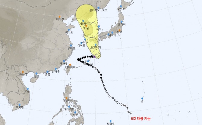 이미지 확대보기기상청은 6일 발표한 오늘 내일 이번 주 날씨에서 엄청난 폭우 등 태풍 카눈이 한반도 타격을 사실상 시작한 것으로 보고 주의를 당부했다. 기상청은 제6호 태풍 카눈 예상 경로가 더 서쪽으로 조정됐다면사 태풍의 영햑권을 부산 대구 등 경상도에서 전국으로 학대했다. 지금 예상대로면 부산 쪽으로 상륙해 강도 '중'의 태풍으로 세력을 유지하면서 전국적으로 타격을 줄 것으로 보인다. 0일 낮 정도에 부산 쪽으로 국내에 상륙한 뒤 같은 날 오후 3시 대구 북쪽 50㎞ 지점까지 올라오겠다. 대구 북쪽에 이를 때까지 강도가 '중'을 유지하면서 이때 영남 대부분은 태풍 폭풍반경(풍속이 25㎧ 이상인 구역), 전국은 강풍반경(풍속이 15㎧ 이상인 구역)에 들겠다. 태풍의 본격 상륙 이전에도 태풍의 영향으로 지역에 따라 큰 비가 온다는 점을 감안할 때 태풍 카눈의 한반도 타격을 사실상 시작됐다. 미국 합동태풍경보센터(JTWC)와 일본 기상청, 중국 중앙기상대 등도 우리나라 기상청과 비슷하게 카눈이 부산 쪽으로 상륙해 우리나라 동쪽을 관통하는 경로를 유력시한다. 현재 예상 경로는 이전 예상치에 견줘 더 서쪽이다 북태평양고기압 세력이 서쪽으로 확대될 것으로 예상되면서 카눈 예상 경로도 서쪽으로 옮겨가는 모습이다.