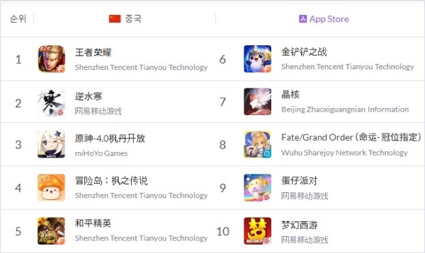 앱스토어에서 메이플스토리M보다 높은 순위를 기록한 게임은 화평정영 외에도 텐센트 '왕자영요'와 호요버스 '원신', 넷이즈가 올해 출시한 신작 MMORPG '역수한(영문명 Justice Online) 모바일'로 모두 중국에서 '국민 게임'으로 꼽히는 히트작들이다.