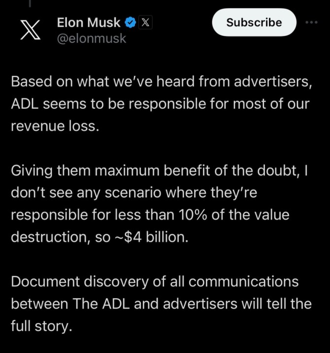 머스크는 X가 가짜뉴스를 퍼나르는 온상이 됐다고 유대인 단체인 ADL을 오히려 표현의 자유를 위협하는 세력이라고 비난하면서 격하게 대립하고 있다.