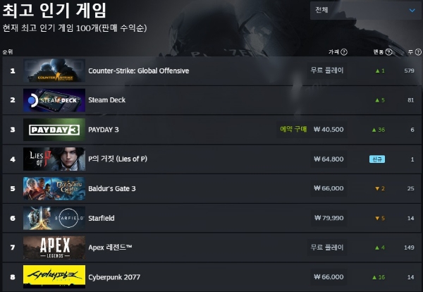 CS: GO는 기출시 F2P(부분 무료화) 게임으로, 이용자들의 인게임 결제가 매출에 반영됐다. 싱글 플레이 패키지 게임으로 치면 '페이데이 3'에 이어 2위에 오른 것으로, 8월 신작인 '발더스 게이트 3'나 '스타필드', 29일 출시를 앞둔 일렉트로닉 아츠(EA)의 'EA 스포츠 FC(구 피파) 24' 등을 제쳤다.