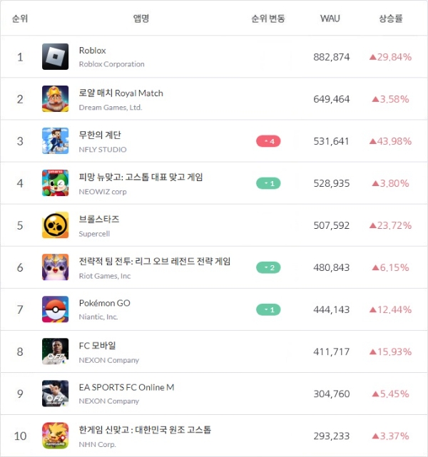 구글 플레이스토어 9월 5주차 톱10 게임 중 가장 높은 수익을 거둔 것은 매출 13위에 오른 넥슨 'EA FC 모바일(구 피파 모바일)'이었다. 이 외에도 '로얄 매치'가 14위, 로블록스가 15위, EA FC 온라인M이 26위를 기록했다.