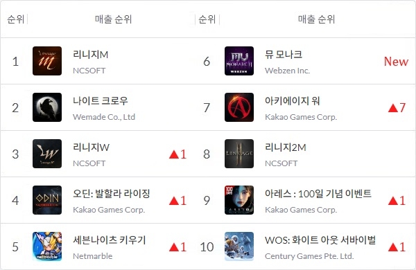 엔씨소프트(NC)의 '리니지M', 위메이드 '나이트 크로우'는 한 주 동안 투 톱의 자리를 지킨 가운데 뮤 모나크 외에도 카카오게임즈 '아키에이지 워', 펀플러스 'WOS: 화이트 아웃 서바이벌' 등이 새로이 매출 톱10에 들었다.