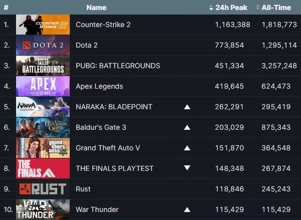'더 파이널스'가 내려간 순위 만큼 넷이즈 '나라카: 블레이드 포인트', 라리안 스튜디오 '발더스 게이트 3', 락스타 게임즈 '그랜드 테프트 오토(GTA) 5' 등의 순위가 올라갔다. 그 위로 '카운터 스트라이크 2'와 '도타 2', 크래프톤의 '펍지: 배틀그라운드' 등은 제 자리를 유지했다.