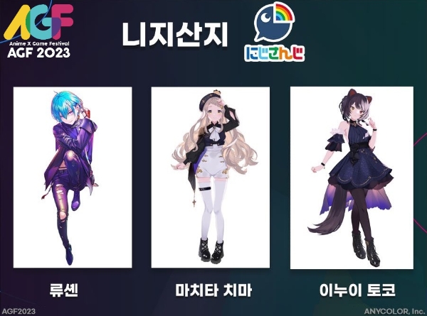 이미지 확대보기AGF 사무국에 따르면 니지산지 소속 버튜버 '류센'과 '마치타 치마', '이누이 토코' 등 3명이 공식 게스트로 이번 행사에 함께한다.
