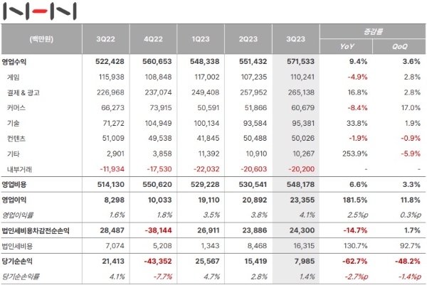 NHN의 핵심 사업군이라 할 수 있는 핀테크 분야 매출과 클라우드 사업이 중심이 되는 기술 분야 매출 모두 지난해 3분기 대비 성장세를 보였다. 반면 게임 사업과 커머스 사업 분야의 매출은 소폭 낮아졌다.