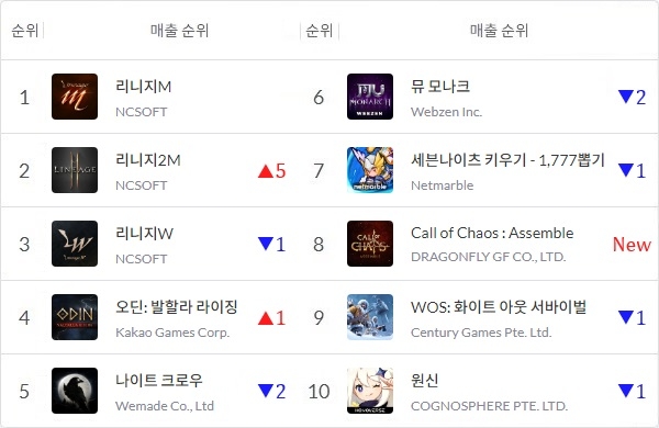 펀플러스의 'WOS: 화이트 아웃 서바이벌'과 호요버스 '원신'이 매출 톱10의 남은 두 자리를 지켰다. 카카오게임즈 '아키에이지 워', 37게임즈 '데블M', 드림 게임즈 '로얄 매치' 등이 그 뒤를 따랐다.
